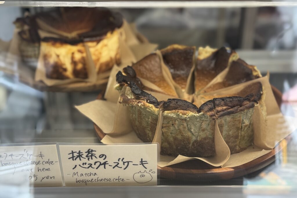 ショーケースにはバスクチーズケーキ(500円)や抹茶や紅茶のバスクチーズケーキ、5号のホールチーズケーキなどが並びます。