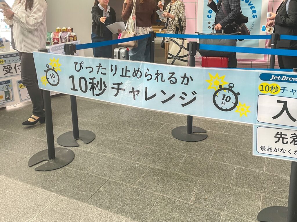 よーい、スタート! で10秒計測します。結果はどうだったかな? 参加賞として「JET BREW」1杯分をプレゼントしてくれます。