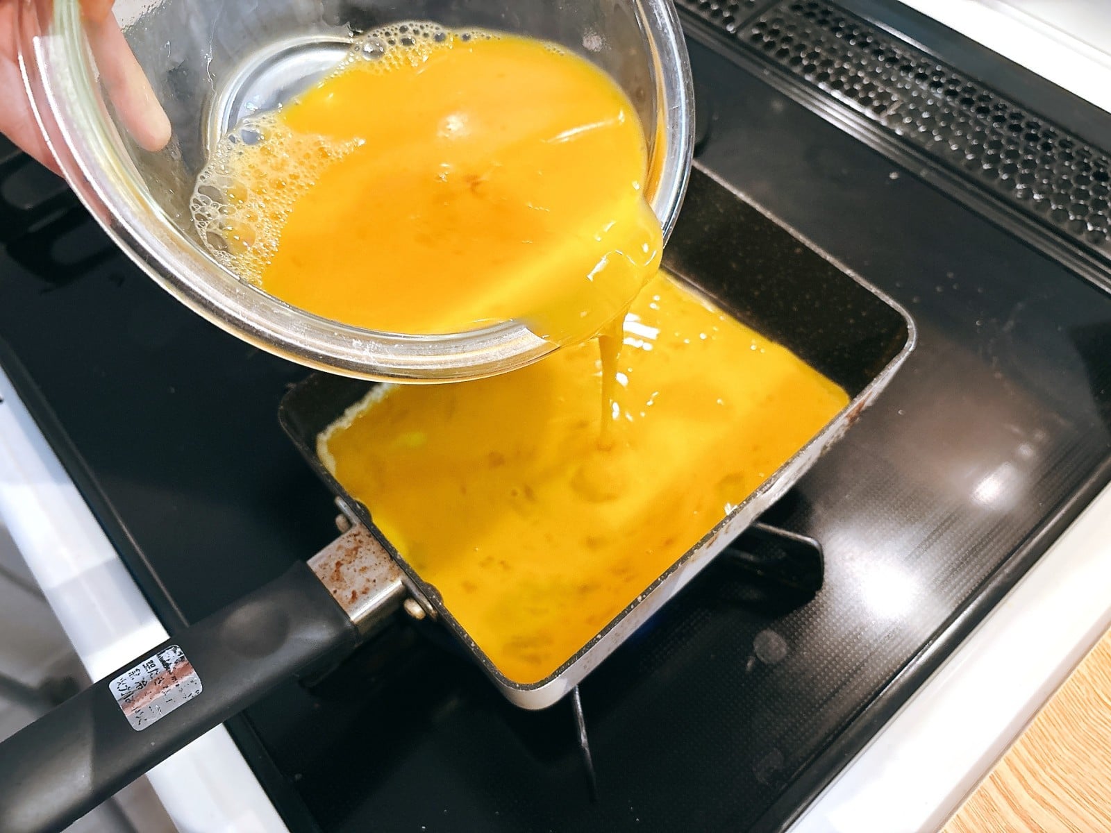 手順2.フライパンに米油をしき、中火でだし巻き玉子を焼いていきます