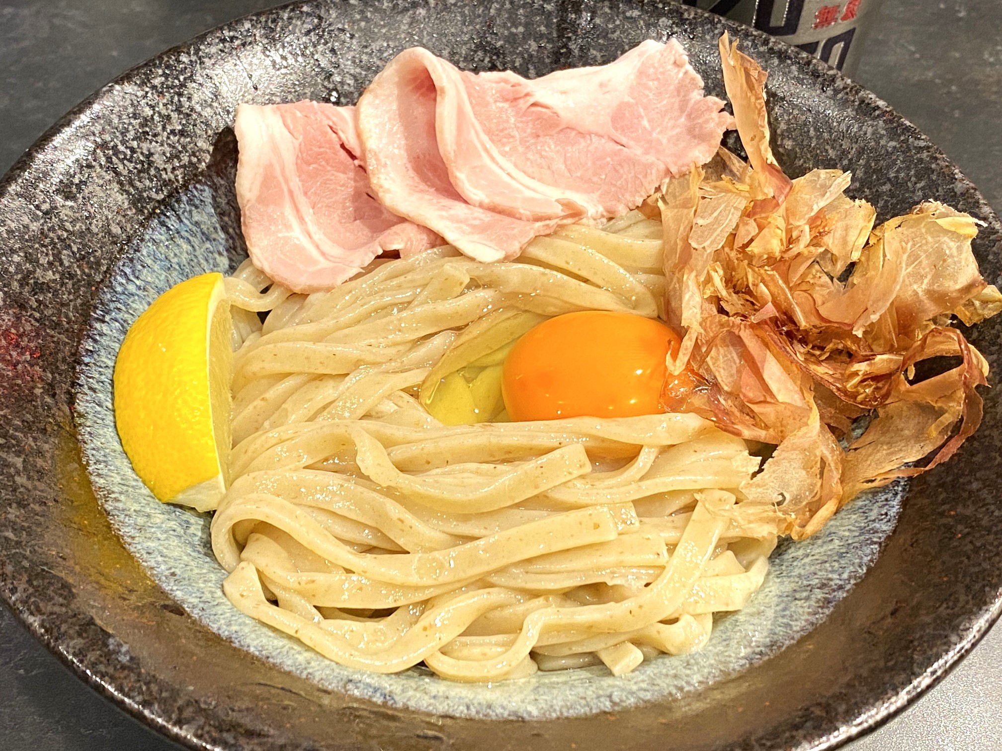 全粒粉の平太麺に生卵、チャーシュー、かつおぶし、レモンが乗ったユニークなまぜ麺「タマゴかけ麺 ゴッド」は同店の名物。