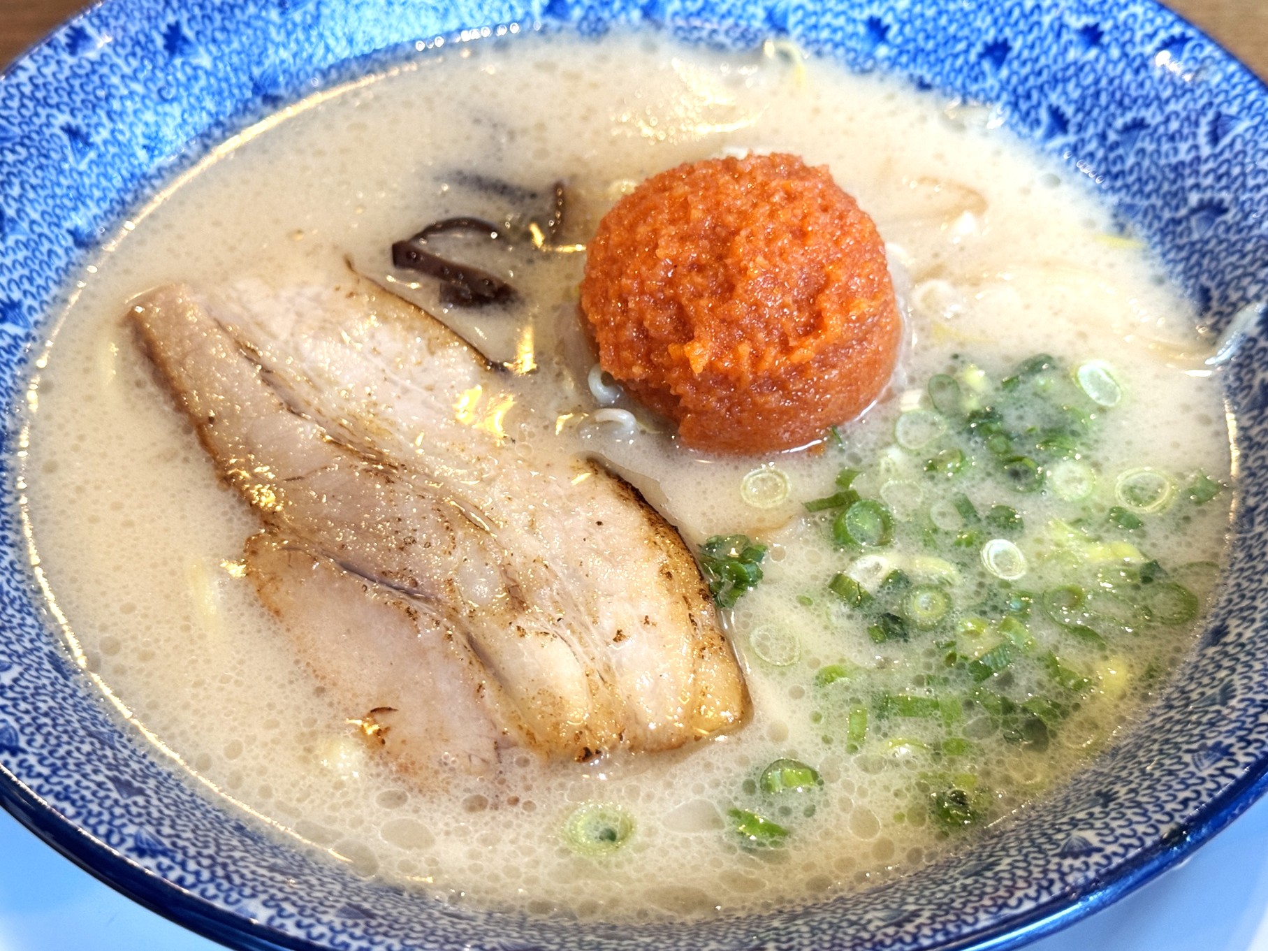 トッピングの明太子はそのままスープに溶いても良いのですが、まずはそのままスープを味わい、少しずつ明太子を溶いていく食べ方がおすすめ。