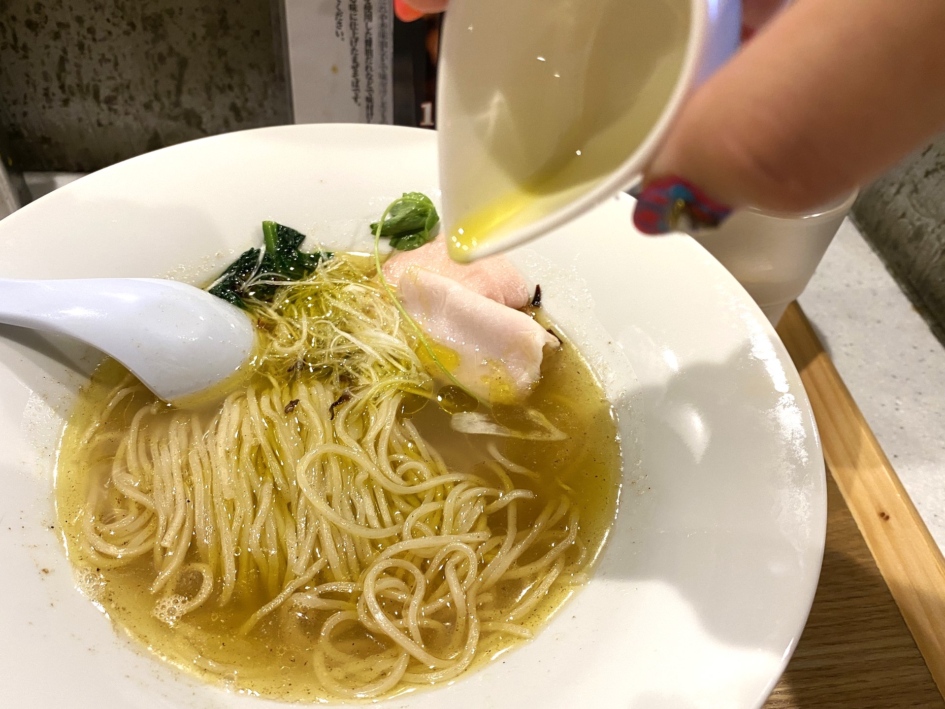 そのままの状態でスープや麺を堪能したあとは、別添えのトリュフオイルをくわえて味変を楽しみましょう♪あらかじめ少量のトリュフオイルが塩そばに使われていますが、トリュフオイルを追加することで、その存在感はとても大きくなります。