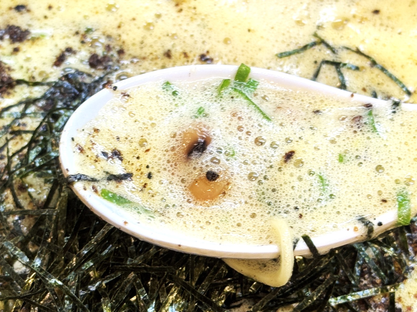 スープの表面を埋め尽くすほどにたっぷり盛り付けられた具材は、ボリュームたっぷりな大盛りでありながらも素材が高たんぱくでヘルシーなのでカロリーも低め。シャキシャキ食感の白髪ねぎが良いアクセントとなっています。