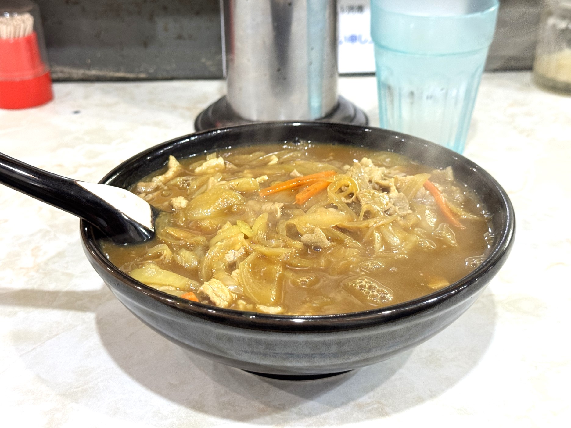 もともと濃い味の豚骨スープに塩辛い明太子をくわえることでコクとほどよい辛味を感じることができますが、塩味が強く悪魔的な濃厚さとなっているので、食後ののどの渇きにご注意を。