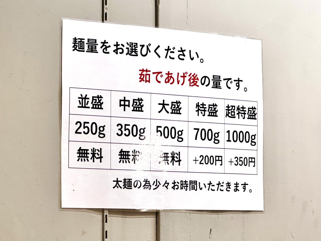 まぜそば並盛の麺の重量は250グラム。一番少ないものでも一般的なラーメンよりだいぶ多い印象ですね。しかも、大盛りまでは無料で増量OKという太っ腹です。
