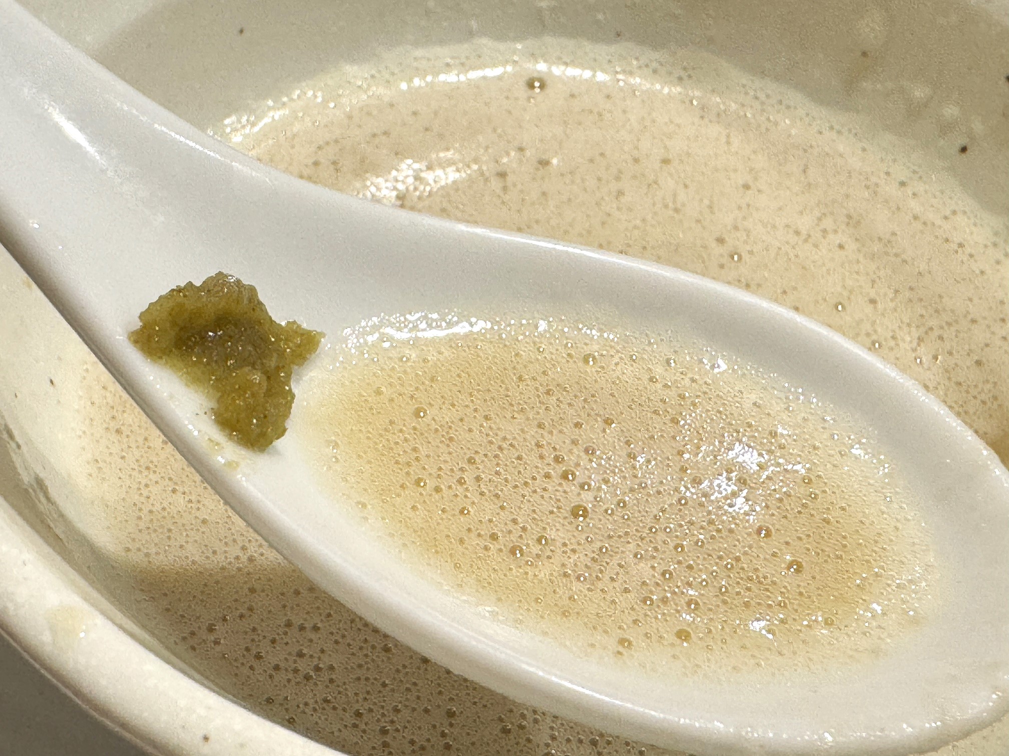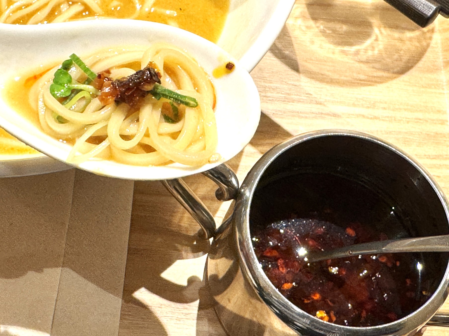 個人的には柚子胡椒をくわえたあとの味わいの方が好みだったので、中盤からはつけスープにそのまま柚子胡椒を投入し、しっかりとスープに馴染ませてから鶏のうまみと柚子胡椒の香りのマリアージュを堪能しました♪
