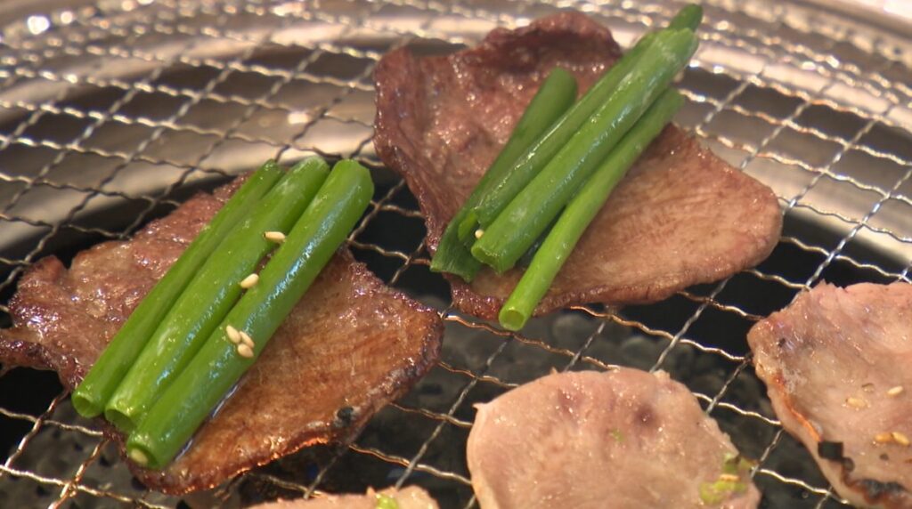 「ねぎ塩タン定食」も人気のランチメニュー。牛と豚のタンを焼いた後、ゴマ油で和えたネギを挟んで食べるスタイルです。