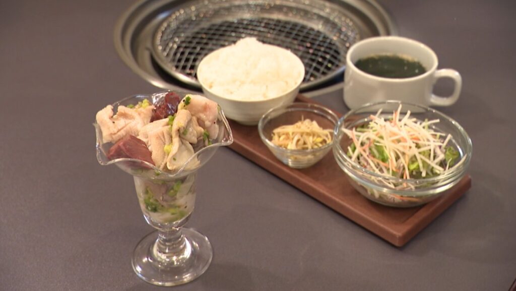 ユニークなビジュアルで話題なのは「肉パフェ」のランチ。パフェグラスに盛られたのはセンマイやハチノス、テッポウなどのホルモン。見た目のかわいらしさとは裏腹に、味は本格的です。