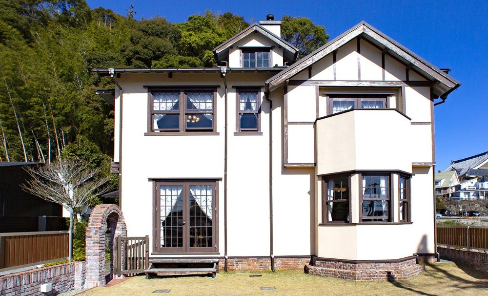 1926年、西村伊作の設計によって建てられた、アメリカ人宣教師チャップマンの旧邸。木造2階建ての住宅で、建物中央に配置された玄関ホールを中心に各部屋へつながる動線が設けられており、プライバシーを重視した設計が特徴です。南側に突き出した半八角形のベイウインドウが印象的で、当時としてもモダンなデザインでした。昭和期に増改築され、一時は旅館として利用されたことも。