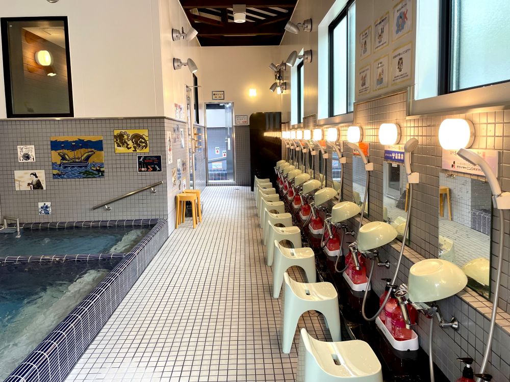 玄関や休憩所は明治、浴場は令和の建物。主浴槽、ぬるめの炭酸泉、露天風呂、サウナ、水風呂で構成されています。無料アメニティーや貸し出しタオル(100円)があるので、手ぶらで訪れて非日常感を楽しんで。
