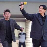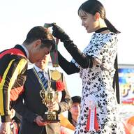 ナレーションとともに、武豊騎手と福永祐一騎手が3本指を掲げる写真も映し出され、会場からは大きな拍手と歓声が沸き起こりました。