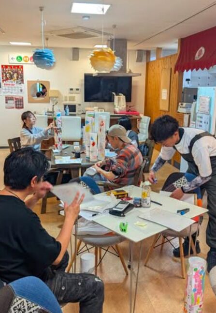 ここで行われたのは、紙灯籠のホッチキス止め作業。