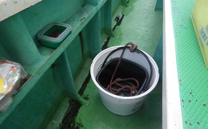潮の流れが緩い影響か、竿が硬いのかはわからないが、エサの食い込みが悪く、釣り上げた魚も取り込んだとたん、バケツの中に落ちてしまう状況だった。
