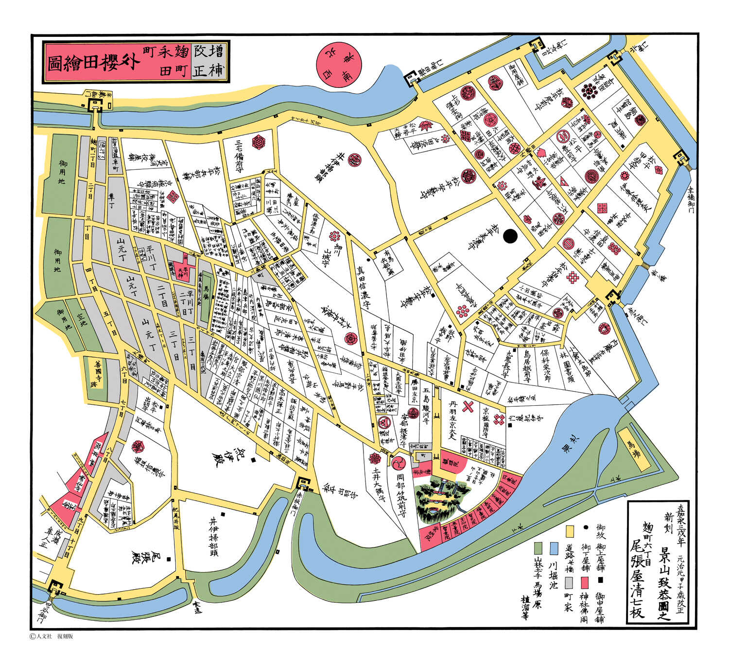 ※掲載の古地図は、江戸の町を32区画に分割して作った切絵図を使用。すべて、麹町にあった金鱗堂が出版したもので、屋号である尾張屋清七から「尾張屋板(版)」と呼ばれる。鮮やかな多色刷りが特徴。