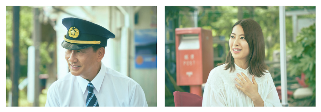 「帰郷」篇では、瀧本さん演じる女性が故郷の駅に降り立つ。そこで待っていたのは、幼い頃から顔馴染みの駅長(中井さん)。「おかえり」と優しく声をかける駅長に、女性の表情は自然とほころぶ。日常の中にある、ほんの一瞬の温もりを描いたシーンだ。