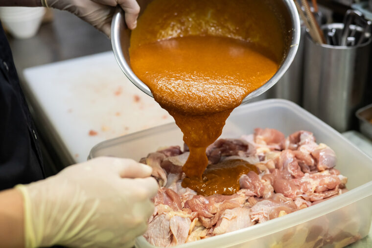 この唐揚げは、新潟市の発酵のまち・沼垂にある味噌蔵・峰村醸造の味噌をベースにしたタレにひと晩以上漬け込んだ鶏肉を二度揚げしたもの。