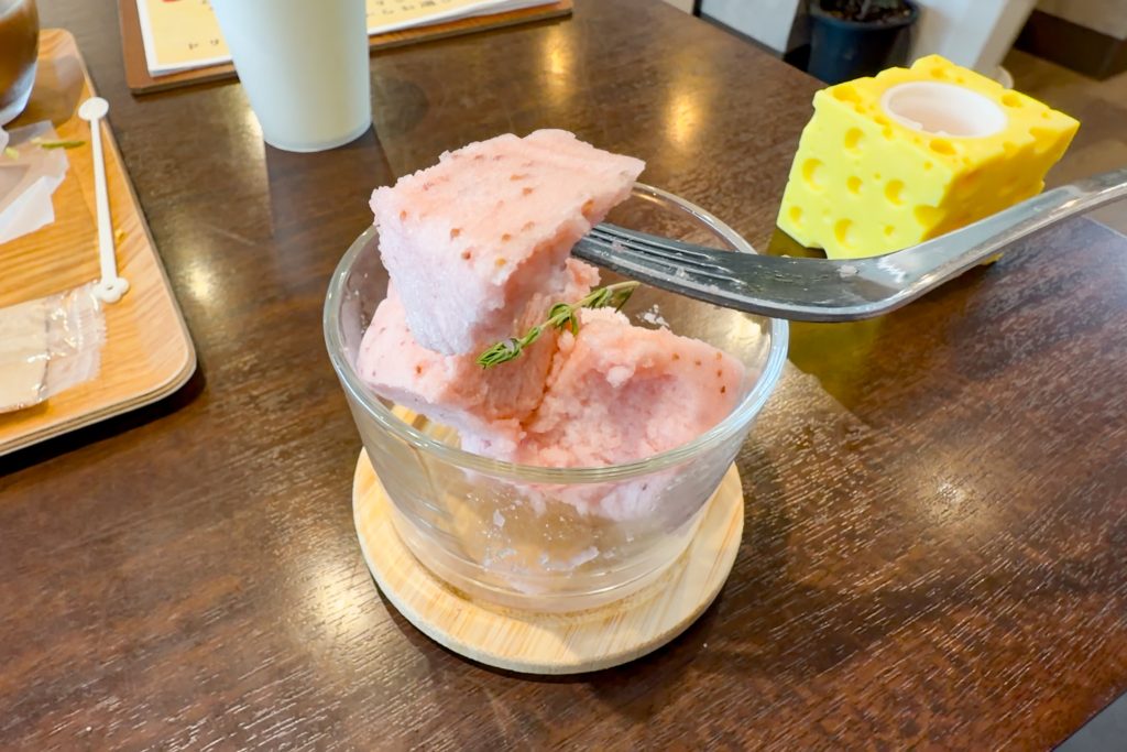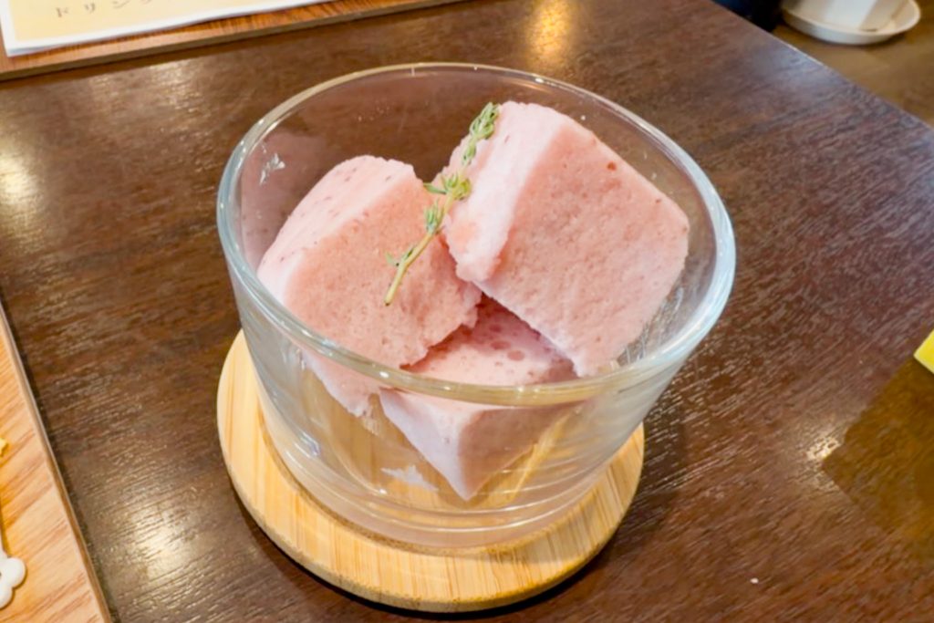 お店の方のご好意で、万博の地域代表お土産品に選ばれた「ローズベリーキモーヴ」を試食させていただきました。
