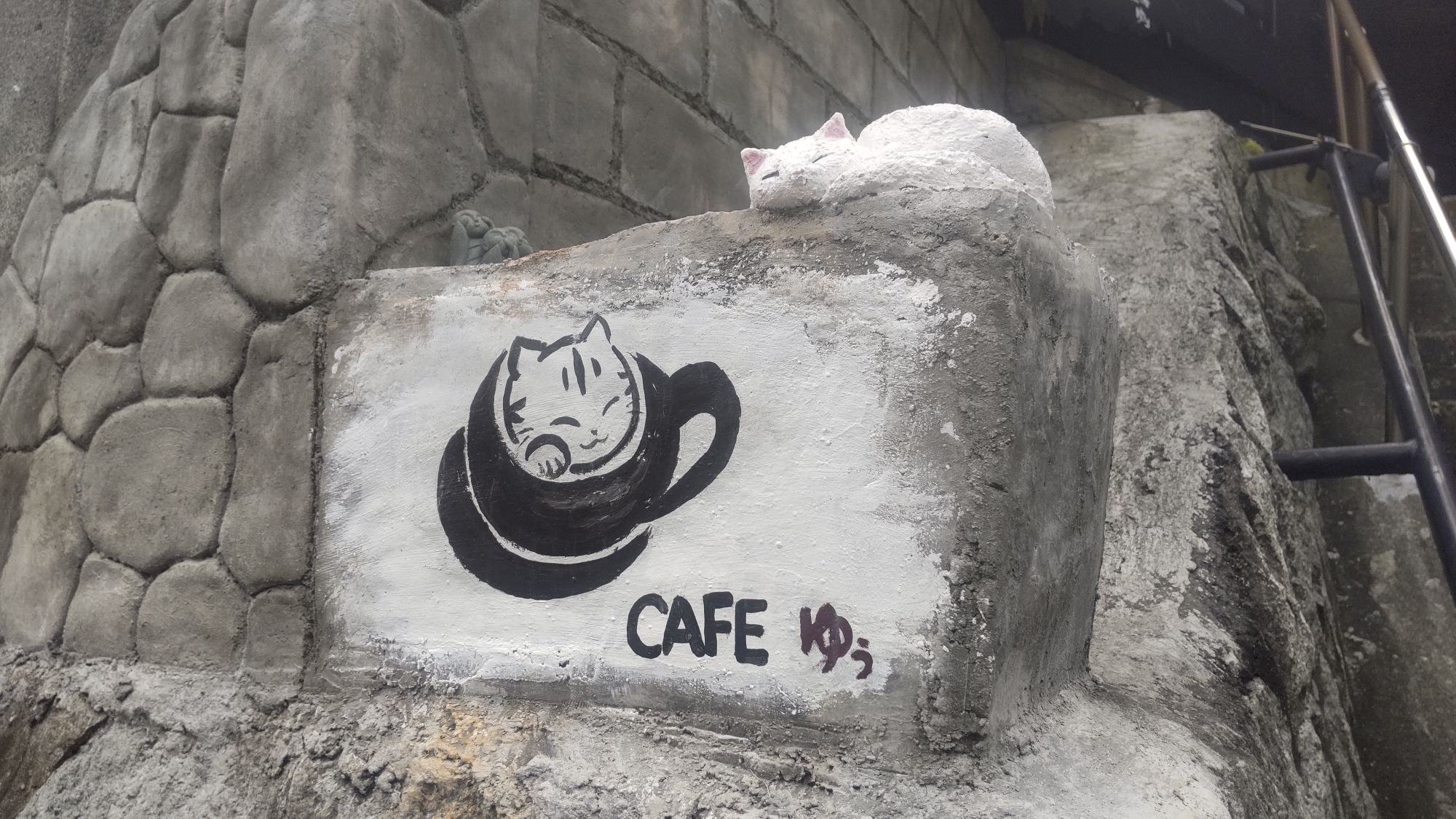 階段を上がる際に猫のイラストを発見。きっと癒される空間に違いない、そんな期待を胸に店内へ足を進めます。