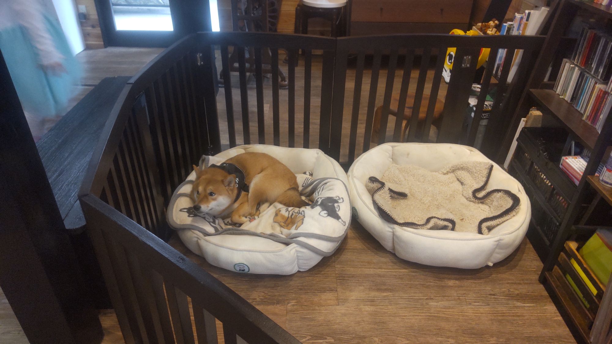 なんと、店内には柴犬の看板ワンちゃんがウトウトしていました。居ても猫ちゃんと思っていたので、変化球の癒しです。