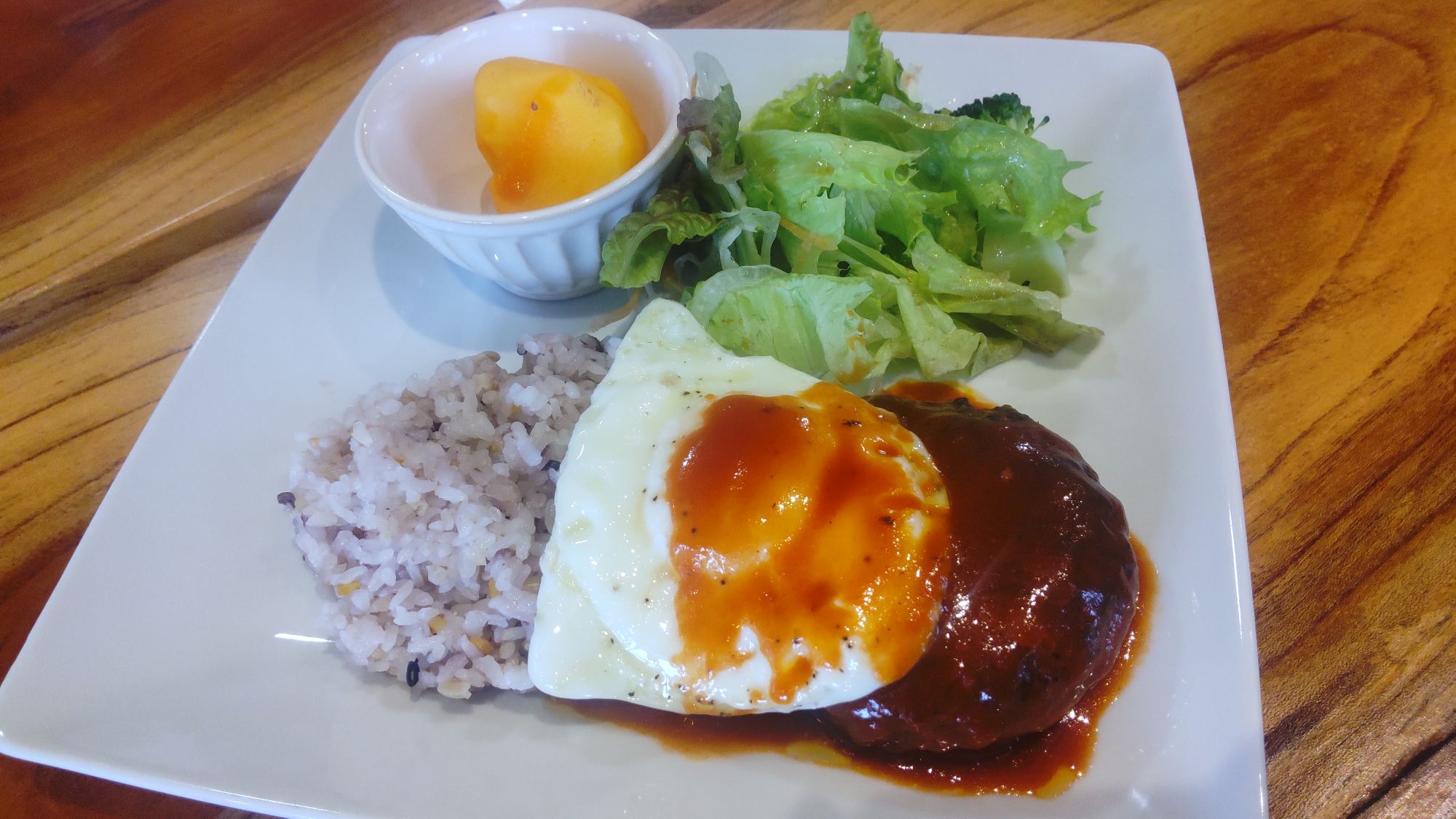 娘が注文したのは、目玉焼きハンバーグ ライス付き(税込800円)。ライスはプラス200円で大盛りにできます。ご飯が雑穀米なのも、ヘルシーで嬉しい!