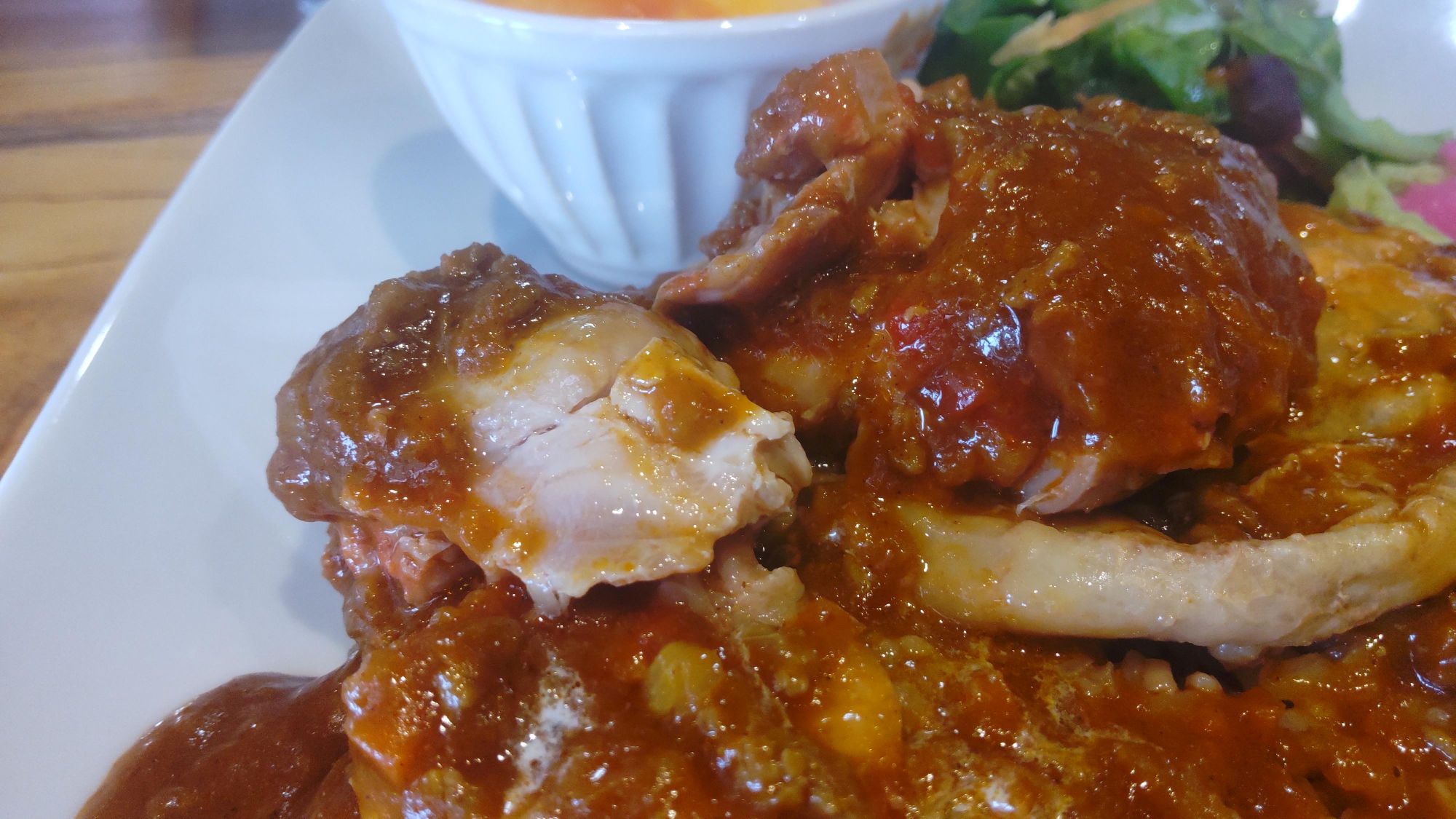 またもや、嬉しいサプライズが!なんと大きな鶏もも肉が1枚、ルーの下に隠れていました。ルーはそこまで辛くなく、お肉と野菜の贅沢な「旨み」を感じました。