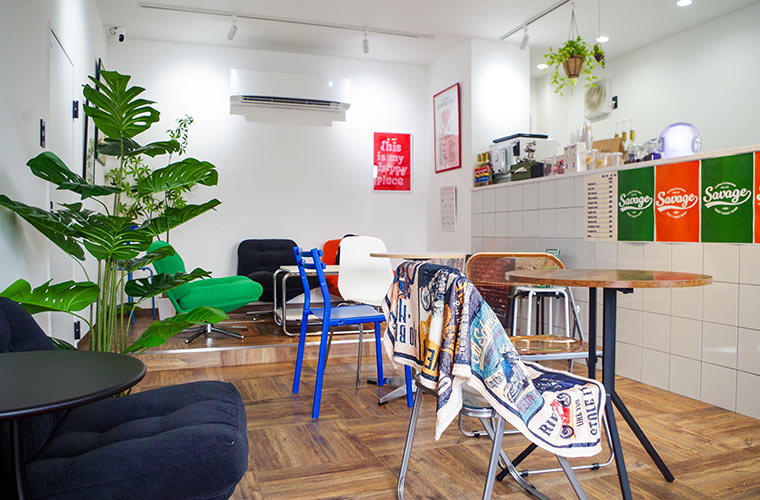 お店の扉を開けると広がるのは、明るく広々とした空間。タイルやグリーンをあしらった海外風の店内は、白を基調にしつつ、所々に差し色を配したポップなカラーコーディネートが目を引きます。配色はもちろん、ポスターやクッションなど、随所に散りばめられた遊び心ある小物にまで、オーナーの洗練されたファッションセンスを感じます。