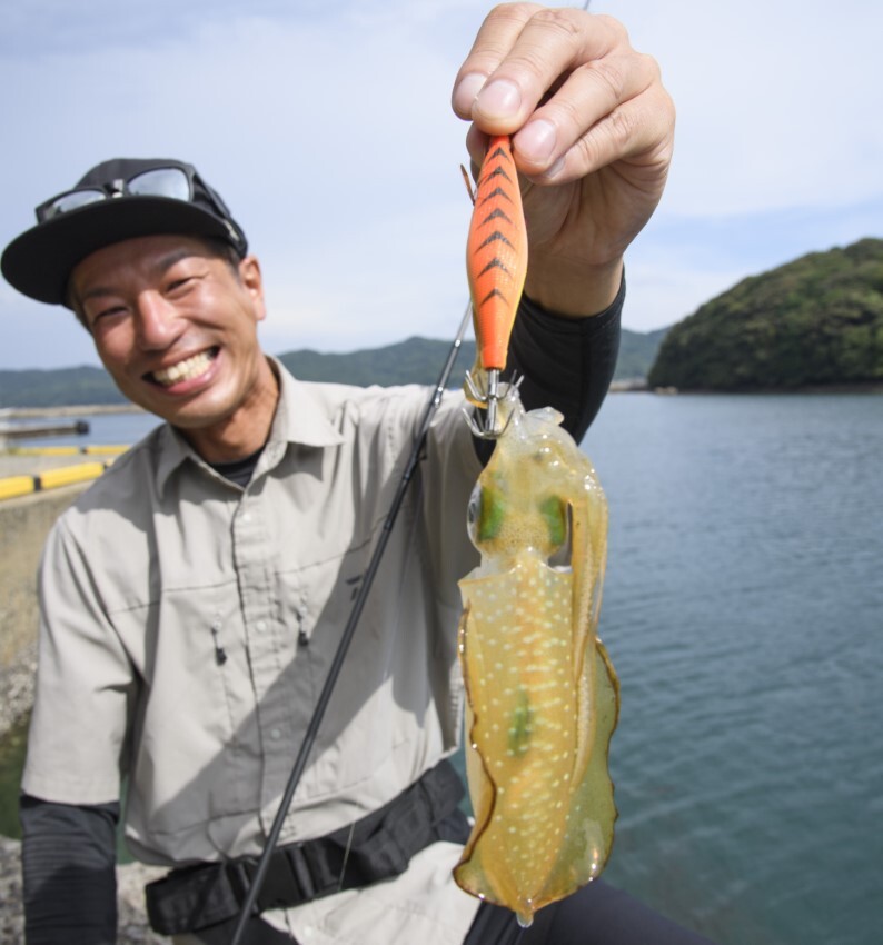 平戸島といえば島内のほとんどの港でアオリイカが釣れ地磯に出ればさらにサイズアップがねらえるエギングパラダイス。秋イカシーズン開幕にはまだ早いタイミングながら、ここなら季節を先取りして楽しめるのではないかと和歌山からやって来たのは木森直樹さん。過去にショアから5.2kgという特大レッドモンスターをキャッチしたデカイカハンターだ。