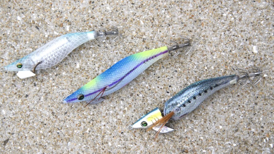 メインで使用したエギ。左から「エメラルダス シャインLCレーザーインパクト」「エメラルダス ダートLC」「エメラルダス アモラス ジョイント」
