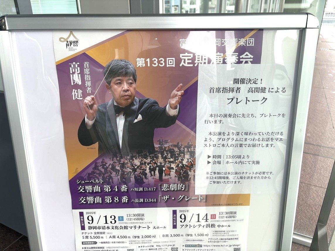 静岡新聞論説委員がお届けするアート&カルチャーに関するコラム。今回は9月13日に静岡市清水区の市清水文化会館マリナート大ホールで開かれた富士山静岡交響楽団の「第133回定期演奏会」静岡公演。首席指揮者の高関健さん指揮による シューベルト作曲「交響曲第4番ハ短調『悲劇的』」「交響曲第8番ハ長調『ザ・グレイト』」。同じプログラムで14日午後1時半から浜松市中央区のアクトシティ浜松でも公演。