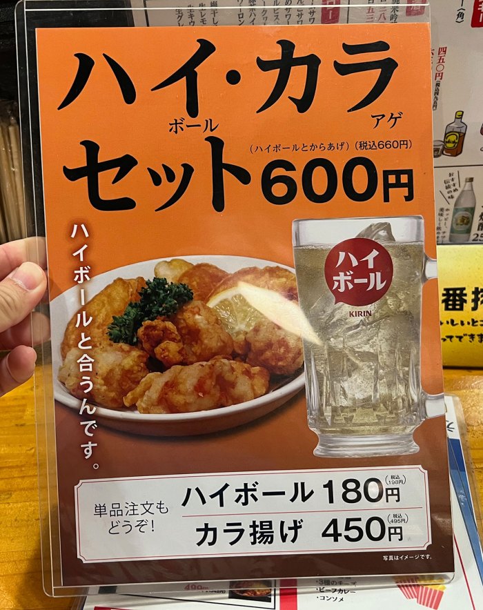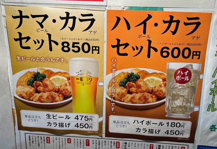 生ビール&唐揚げのナマカラセットが850円(税込935円)、ハイボールと唐揚げのハイカラセット600円(税込660円)と書かれた貼り紙を見つけた。しかも、写真を見る限り量が少ないわけでもなさそう。