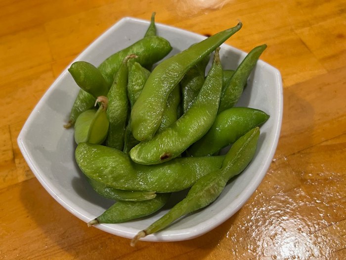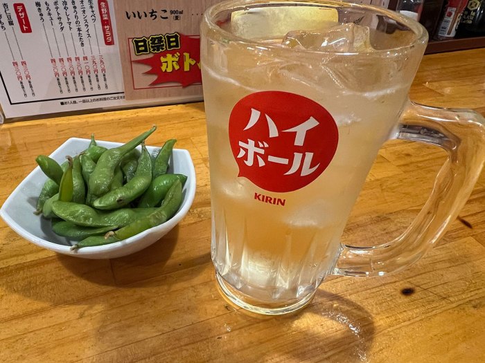 さぁ、ここからトータルでいくらかかるのか? と思いながら待つこと約1分。ハイボールと同時に、お通しの枝豆が運ばれてきた。