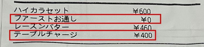 で、結論から言おう。こちらのお店、店を出たときにレシートを確認すると、注文したもの以外では「ファーストお通し0円、テーブルチャージ400円」と記載されていた。