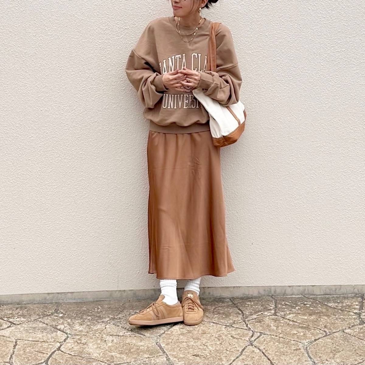 スウェットもスカートもキャメルでまとめてワントーンコーデに仕上げれば、おしゃれで大人可愛い印象に見えますよ♡