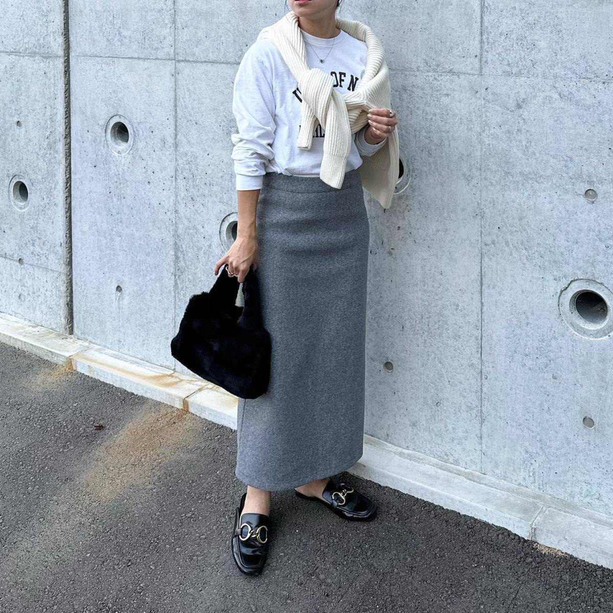 長袖のロゴトップスとロング丈のタイトスカートの組み合わせは秋の気候にピッタリで、おでかけのときに着る機会が多いコーデ♪