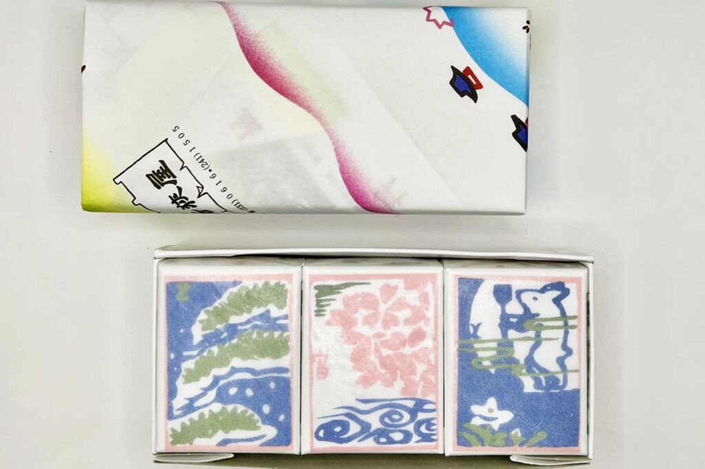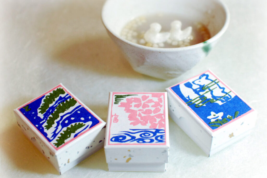 100年以上愛される京菓子を届ける[二條若狭屋]では、雪・月・花が描かれたかわいい小箱を販売。小箱の中身はなんと葛湯で、熱いお湯を注ぐだけでとろりとした葛湯に早変わり。雪はシンプルな真っ白の葛湯、月は抹茶風味、花はしること箱の絵柄によって中身も異なる。月と花はお湯を注ぐと、焼き麸で作った千鳥とあられが浮き上がるなど、楽しい仕掛けも。