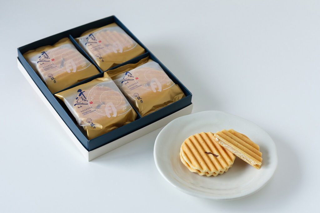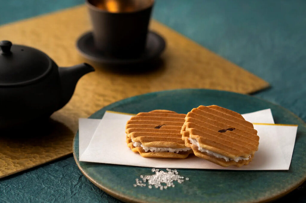 1945(昭和20)年創業の[京菓子處 鼓月]では、厳選素材を使用したプレミアム千寿せんべいがおすすめ。国産のブランド小麦粉・宝笠など2種類を使用する生地に風味高いバターとザラメを練り込み、サクッとした口当たりの良さを実現。クリームには練乳を配合することで、従来よりも香り深いコクのある味わいに仕上げている。他にも京都の特産品である宇治抹茶を使用した姫千寿せんべい有機抹茶も人気で、宇治抹茶の深みと上品な甘さ、ほろ苦さが後をひく味わいだ。特徴的な見た目は波間に飛鶴の影が映るおめでたい情景を表しているそうで、贈り物や手土産にもぴったり。