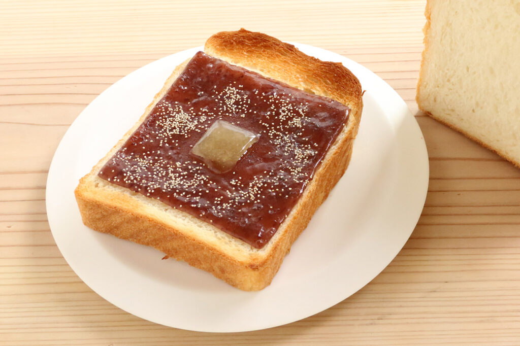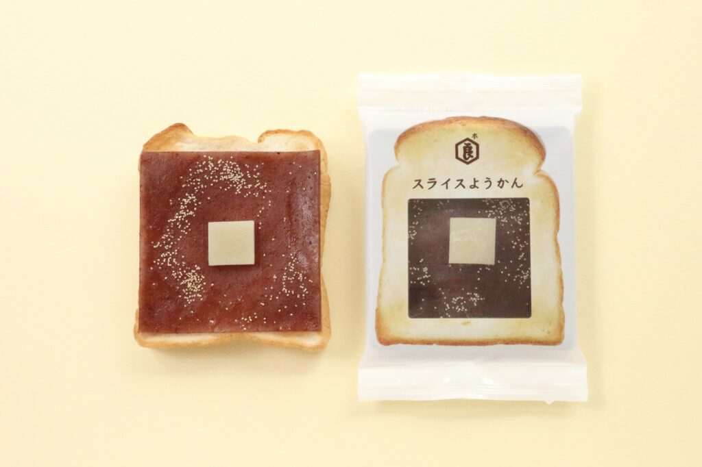 1803(享和3)年創業の老舗和菓子店が生み出した新しい和菓子。羊羹を薄いシート状にしたスライスようかんはパンにのせて焼くと、とろりと溶け出し熱々の小倉バタートーストになる。丹波大納言小豆の粒あん羊羹に、塩を利かせたバター羊羹とケシの実をトッピングして味のアクセントに。