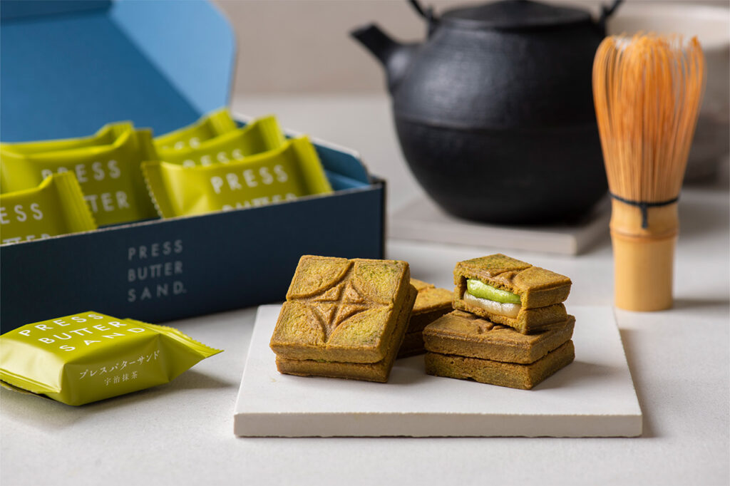 ギフトやご褒美スイーツとして人気のプレスバターサンド。京都のご当地商品である宇治抹茶味は、すっきりとした香りと爽やかな苦味の抹茶がコクのあるバターと絶妙にマッチ。クッキー生地にも宇治抹茶が練り込まれているので、封を開けた瞬間から香りを感じられる。なめらかなクリームの口溶けとサクサクなクッキー生地とのコントラストを楽しんで。