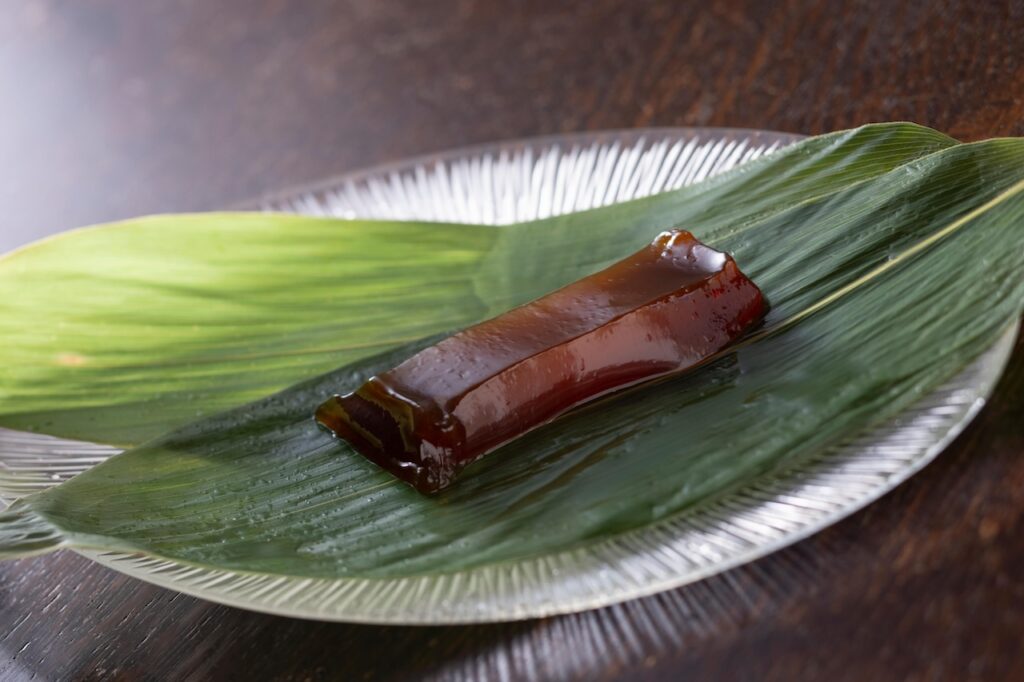 [高台寺和久傳]で、料理の締めくくりに出されていたれんこん菓子 西湖(せいこ)。レンコンのでんぷん蓮粉と和三盆糖を練り上げており、上品な甘さとモチモチした口当たり、つるりとした喉越しを爽やかな笹の葉の風味とともに楽しめる。繊細な口当たりを損なわないよう、笹の葉に包む作業は手作業で行われている。