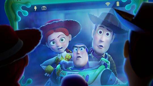 大好きなおもちゃたちが続々登場する映像では、子ども部屋に届けられた箱を前に、レックスとスリンキー・ドッグはブルブル震え、目を覆い指の隙間から覗くフォーキーとカレン・ビバリー、恐ろしいモノを見たようなミスター・ポテトヘッドはすかさずミセス・ポテトヘッドの目を剥ぎ取り、ジェシーとブルズアイが怯えきっている表情を浮かべるシーンからはじまる。