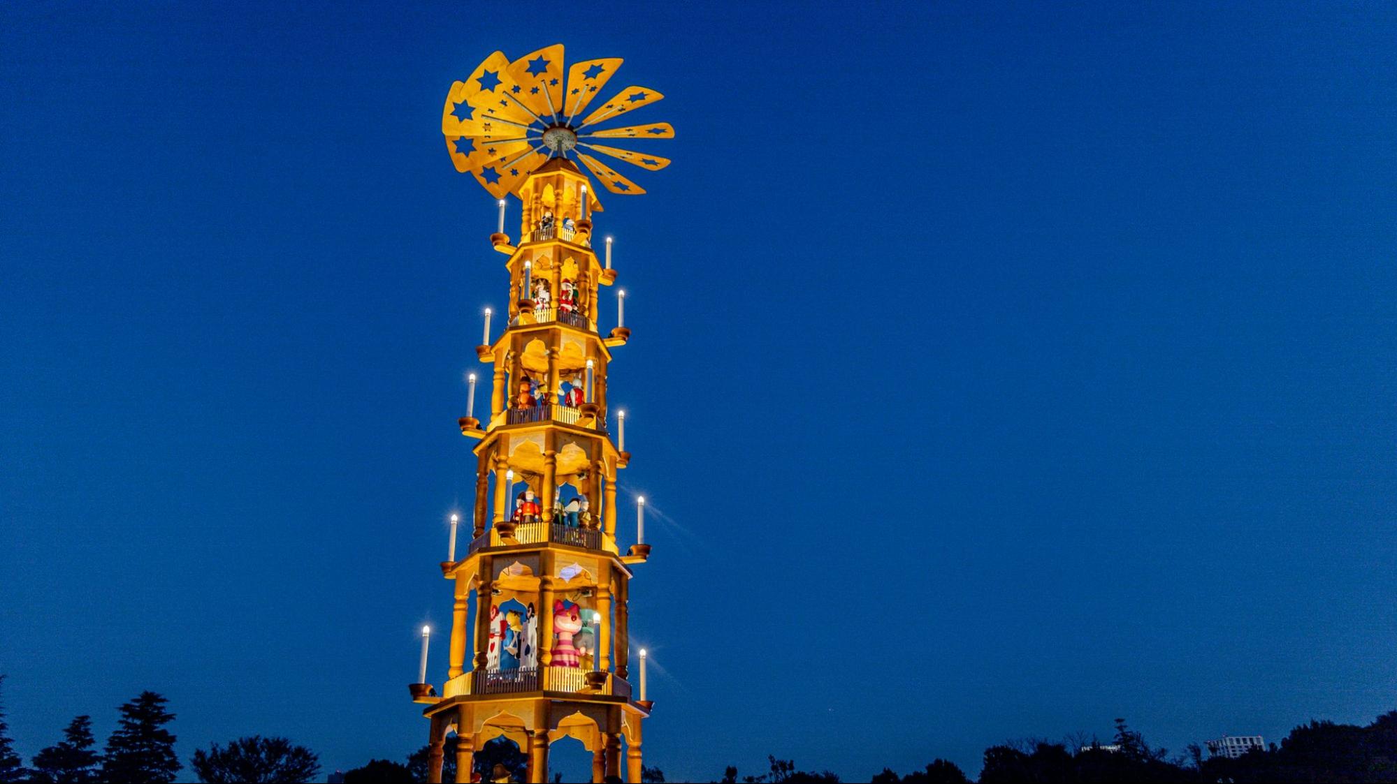 今年は芝公園御成門駅前との2会場開催で、どちらにもドイツから直輸入した本格的なクリスマスピラミッドが設置されています。