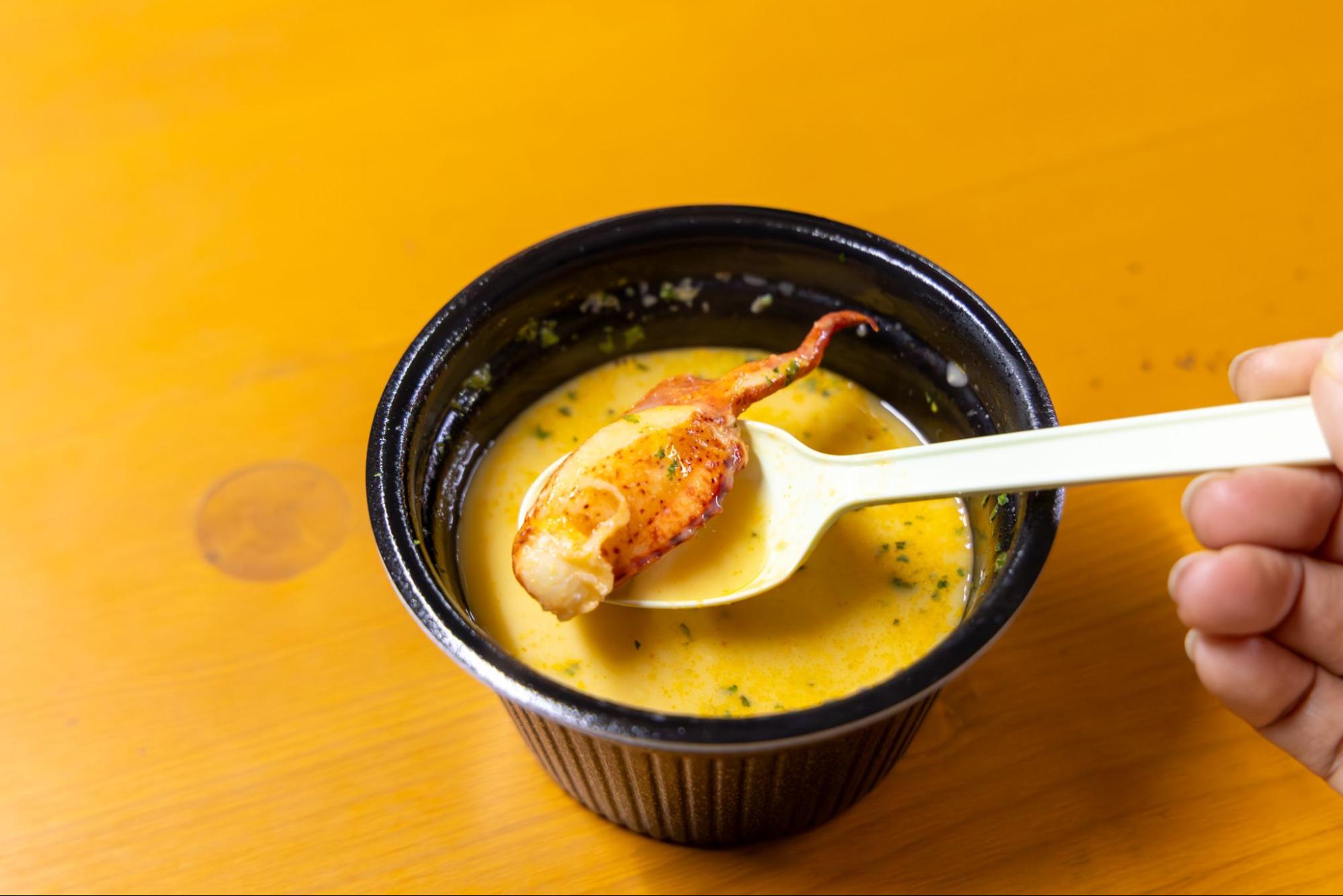 ロブスターの旨味がつまった濃厚なビスク。外の冷たい空気の中で飲むと、身体の中までじんわり温まる感覚に。