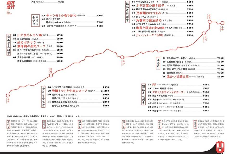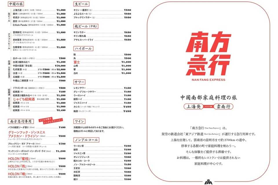 南方急行のコンセプトは上海から雲南へと向かう架空の列車に乗って、各地の家庭料理を味わう。あっさりした塩味や醤油を使い甘めに味付けの上海、激辛で香ばしい味付けの湖南、どこか東南アジアを想起する雲南・・料理のルーツをたどるとその土地の物語がある。列車が停まるたびにその土地の家庭料理やビールが出てくる…そんな旅をイメージしながら、一皿ずつ、一杯ずつ楽しんでみるのはいかがでしょうか。
