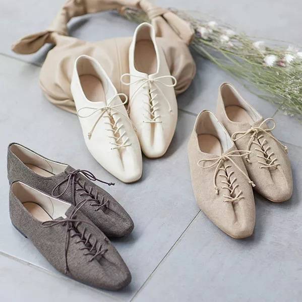 生地感やレースアップデザインが華やかで、スカートスタイルやオフィスコーデに合わせると一気に垢抜けるフラットシューズです。