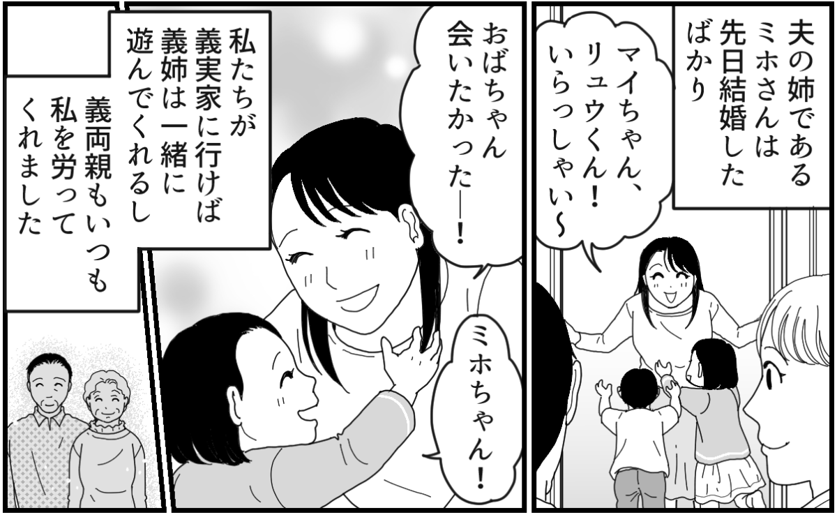 私(ユイ)は、夫のヒロトと2人の子どもたち(マイ・リュウ)の4人暮らしです。共働きのため、夫とは家事育児を分担。子どもたちは保育園に通っています。わが家から車で30分ほどの距離に義実家があります。夫の姉・ミホさんは最近結婚したばかり。子どもはまだいませんが、ウチの子たちをわが子のように可愛がってくれますし、義両親もとても優しくていい人たちです。温かい人たちに囲まれて私は幸せに暮らしていました。