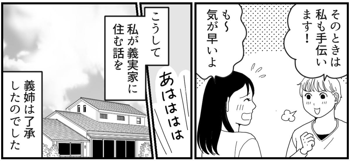 義姉にとっては、思ってもみない出来事だったかもしれません。弟が亡くなったあとに、まさか自分の実家でその妻が子どもたちと暮らしはじめるだなんて……。 でも義姉もきっと、ショックを受けている義両親の状態や、老後のことを心配していたのでしょう。私が義両親の養子となって一緒に暮らすことを許してくれました。 たとえ私が住んでも、義実家が義姉の実家であることは変わりありません。今まで以上に義姉を良く知り、仲良く過ごしていければいいな……そんなふうに思ったのでした。
