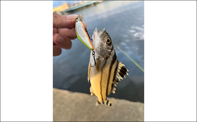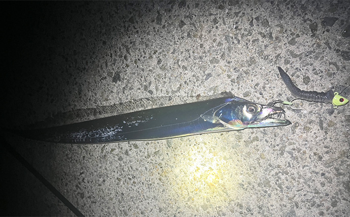 その後も2つの河川の合流点にルアーを投げ探って15cm程のメッキをゲット。同じポイントで同サイズのセイゴも釣れ、日が落ちたところでタチウオのポイントに向かう。