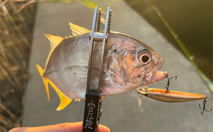 程なくしてグンッ!とアタリが。グングンと引いているがメッキとは違う引き。正体はコトヒキ。この魚もルアーには好反応を示す魚で、河川のライトゲームでは良く出会う魚だ。