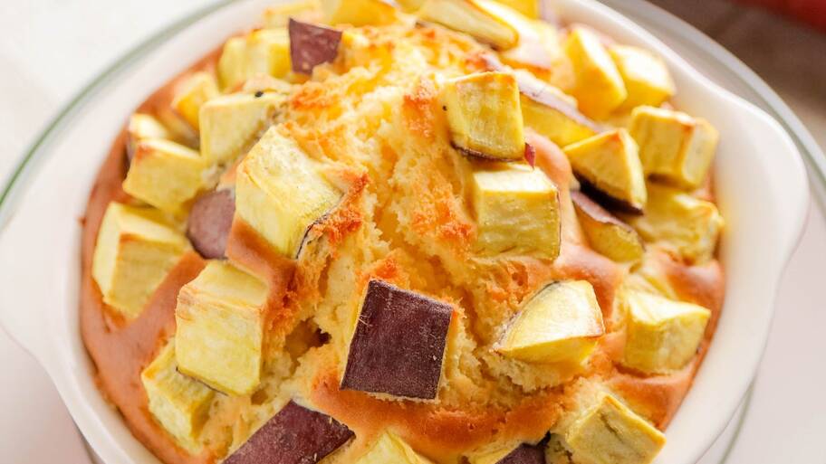 7: 耐熱容器にじゃがいもを並べ、⑥を流し入れたら、チーズをのせます。