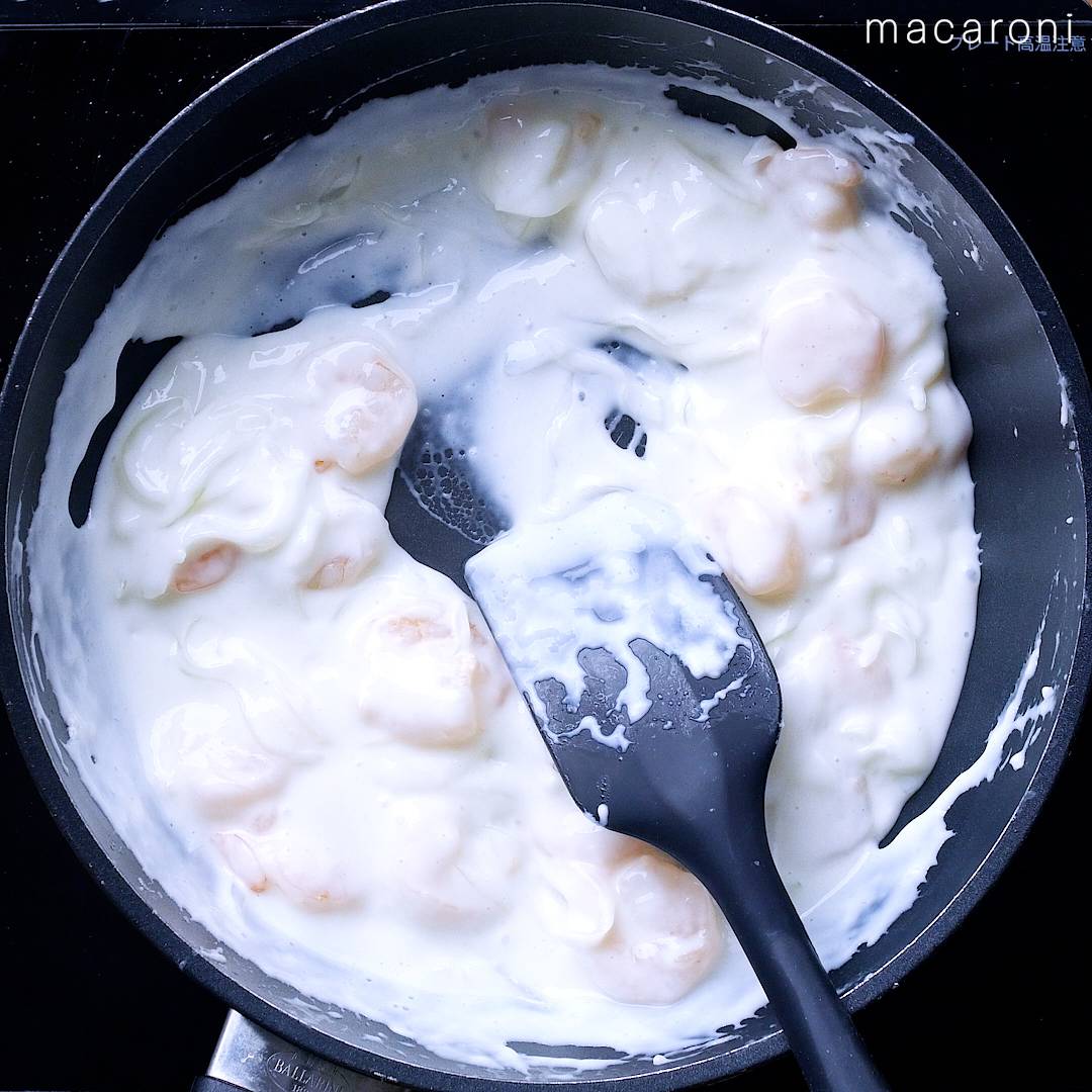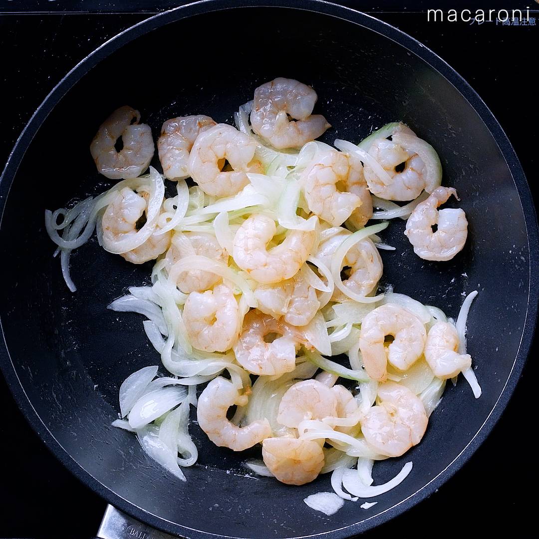 3: むきえびを加えて、色が変わるまで炒めます。